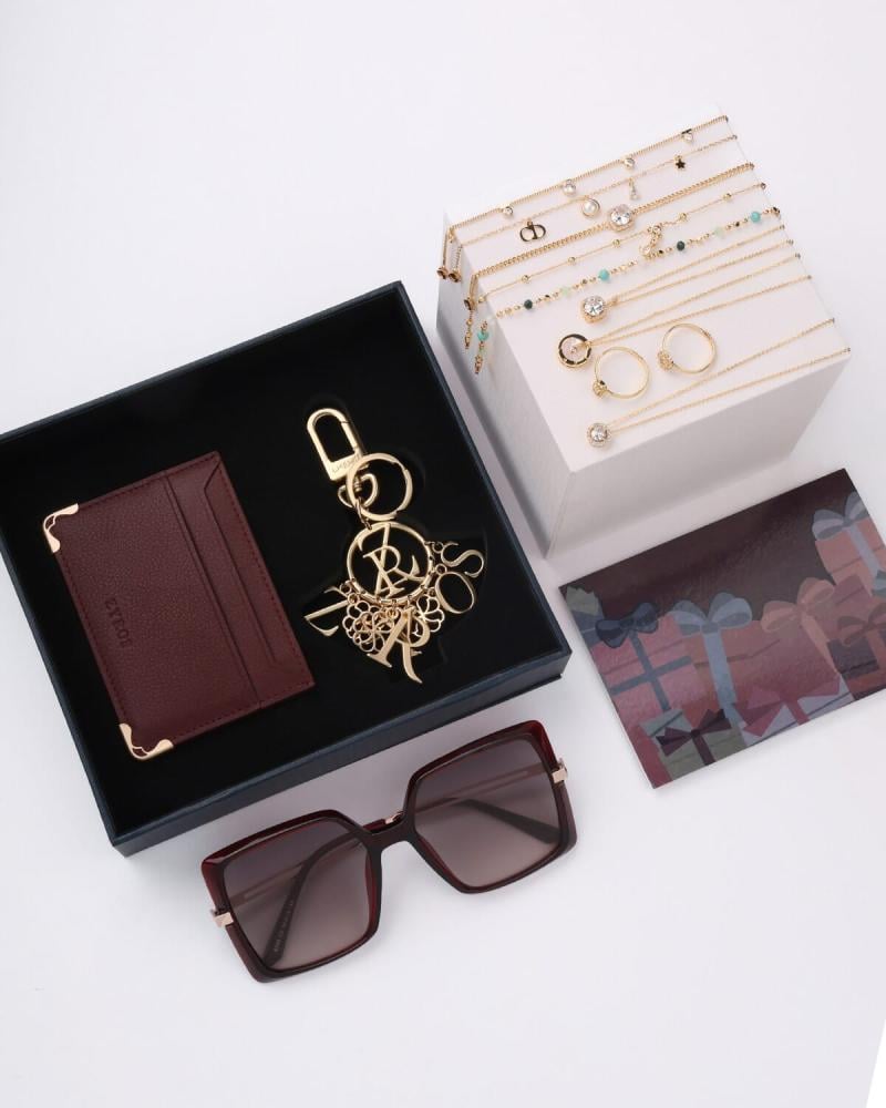• تحتوي الهدية على: محفظة وميدالية ونظارة شمسية و مجموعة من الاكسسوارات وكرت إهداء