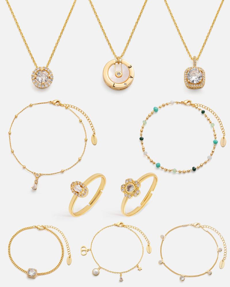 • الاكسسوارات: مجموعة الاكسسوارات المتنوعة باللون الذهبي سلاسل واساور وخواتم تتزين بعضها بفصوص الزركون اللامعه