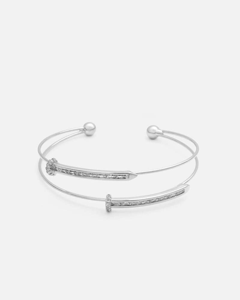 التفاصيل: اسوارة بتصميم اسورتين متصلة معا باللون القضي وتتزين بحلي مرصعة بفصوص الزركون اللامعة البراقة