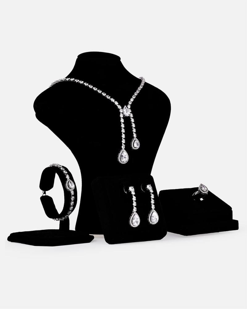 يتميز الطقم بتصميمه الذي يتزين بحليه بشكل دمعة تتزين بفصوص من الزركون اللامع