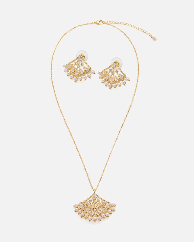 يتميز الطقم بتصميم حلية بشكل مميز مرصعة بفصوص الزركون البراقة تضفي لمسة من الجاذبية